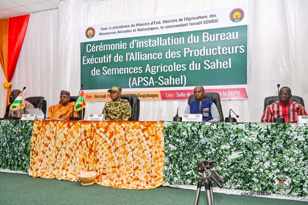 Présidée par le ministre d’État, ministre de l’Agriculture, des Ressources Animales et Halieutiques, le Commandant Ismaël SOMBIE, la cérémonie d’installation du bureau exécutif de l’APSA-Sahel a connu la participation effective du ministre nigérien en charge de l’Agriculture, le Colonel Mahaman El Hadji OUSMANE, qui voit en la création de l’APSA-Sahel une volonté de souveraineté, de dignité et d’indépendance en faveur d’une politique agricole commune pour les trois Etats. Quant au tout premier président du Bureau Exécutif de l’APSA-Sahel, Inoussa OUEDRAOGO, la création de cette nouvelle Alliance qui regroupe les producteurs semenciers des 3 pays de l’AES, vise à mobiliser, organiser et professionnaliser la production de semences de qualité, adaptées aux sols, au climat et aux défis liés au développement agricole dans l’espace communautaire. Durant son mandat, Inoussa OUEDRAOGO s’engage à accompagner les producteurs semenciers dans l’objectif de contribuer à l’atteinte de la souveraineté alimentaire dans les trois pays.